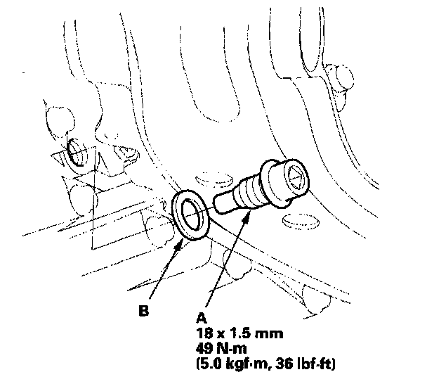 4. Reinstall the drain plug with a new sealing washer (B).