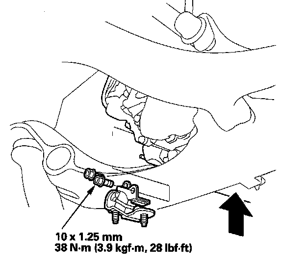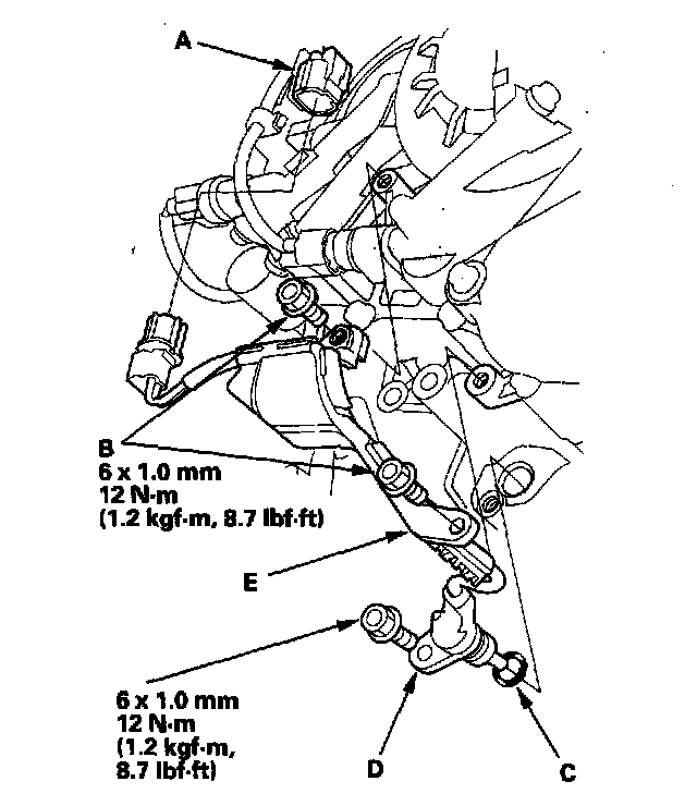 11. Secure the ATF temperature sensor harness clamp (E) with the bolts.