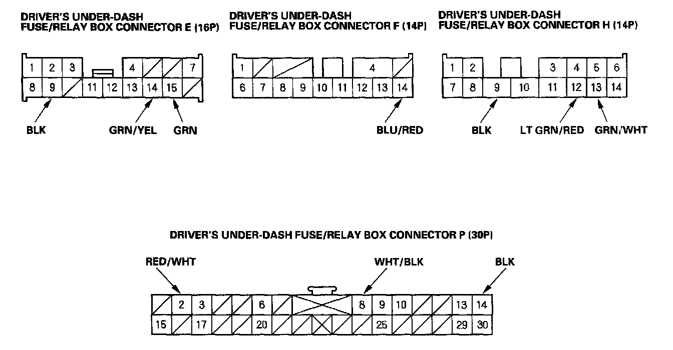 3. Disconnect the driver's under-dash fuse/relay box connectors E, F, H, and P.