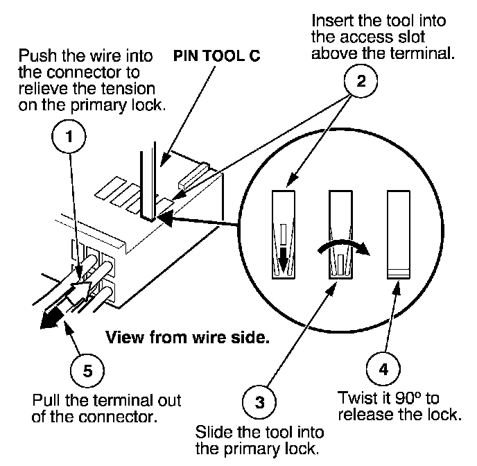 Before you begin, inspect the wire you are about to repair for damage and length. Make sure the wire will be long enough to make a terminal repair without stretching it when you reinstall the terminal in the connector. If the wire is too short, or if access to the connector is too restricted to make a terminal repair, you may need to install a pigtail terminal (a short length of wire with a factory-crimped terminal on it). Refer to HOW TO INSTALL PIGTAIL TERMINALS.