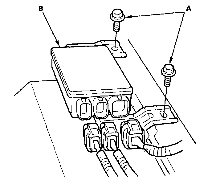 4. Disconnect the connectors. Remove the mounting bolts (A) and the front passenger's weight sensor unit (B) from the seat riser.