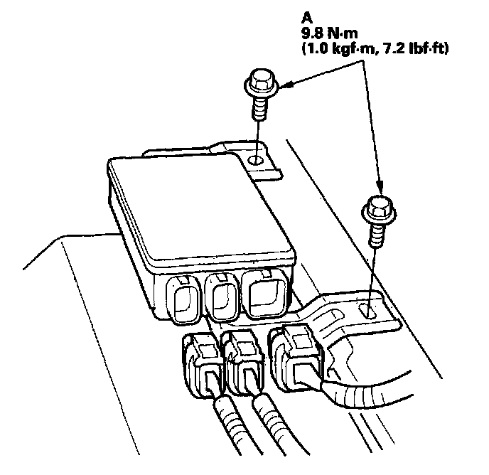 1. Place the new front passenger's weight sensor unit on the seat riser. Tighten the two mounting bolts (A) and connect the connectors.