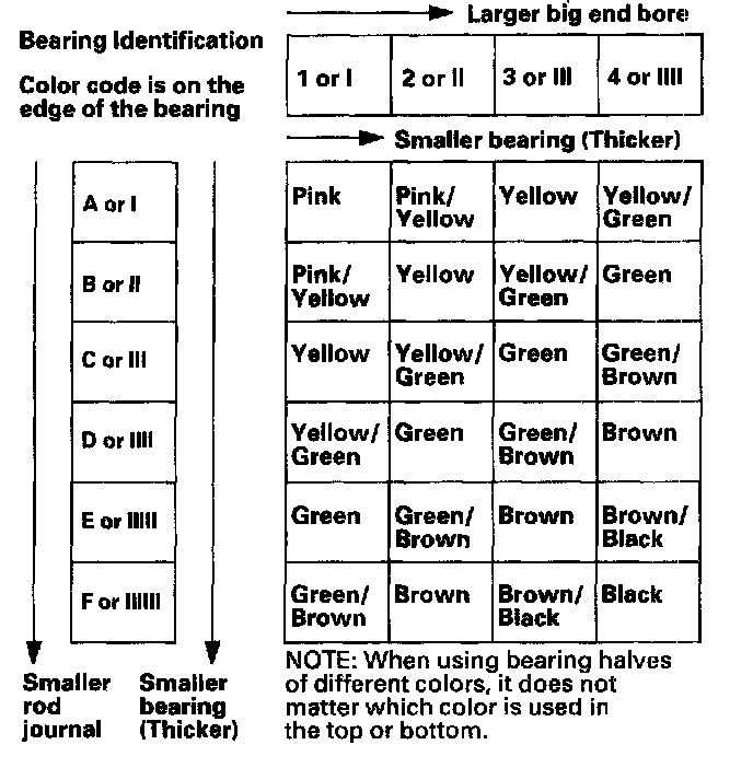 Numbers or bars have been stamped on the side of each connecting rod as a code for the size of the big end. Use them, and the letters or bars stamped on the crank (codes for rod journal size), to choose the correct bearings. If the codes are indecipherable because of an accumulation of dirt and dust, do not scrub them with a wire brush or scraper. Clean them only with solvent or detergent.