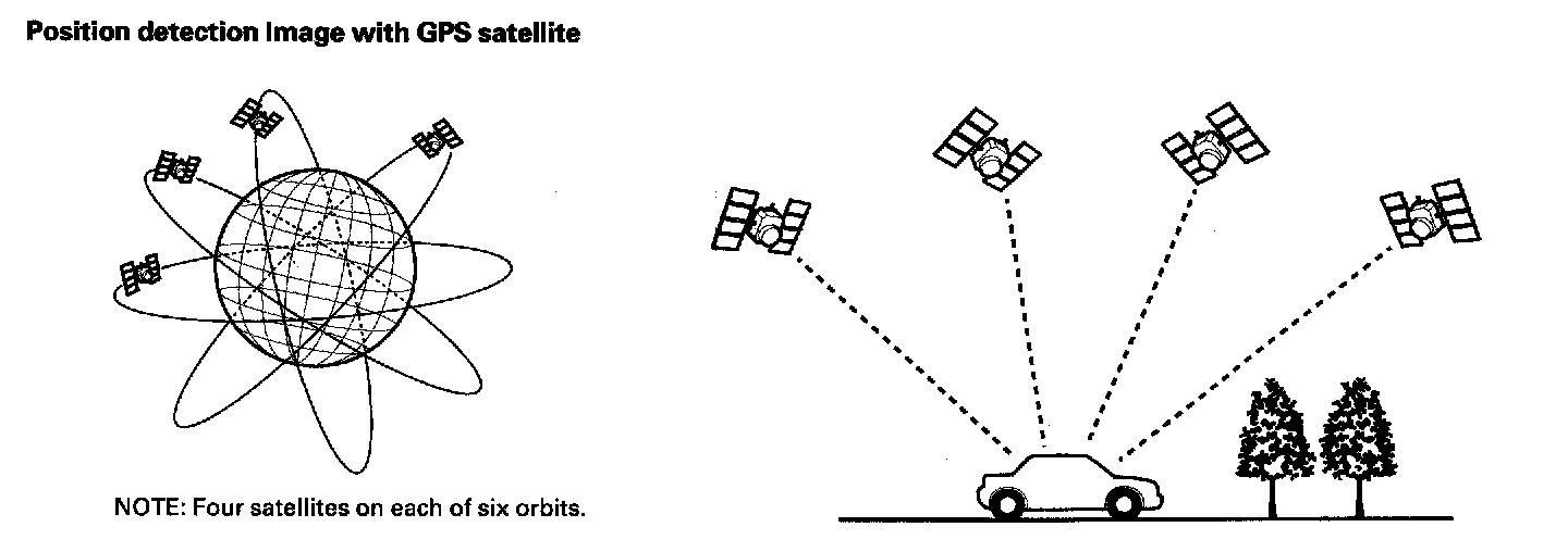 The global positioning system (GPS) enables the navigation system to determine the current position of the vehicle by utilizing the electric waves transmitted from the satellites in orbit around the earth. The satellites transmit the satellite identification signal, orbit information, transmission time signal, and other information. When the GPS receiver receives the electric waves from three or more satellites simultaneously, it calculates the current position of the vehicle based on the distance to each satellite and the satellite positions on their respective orbits.