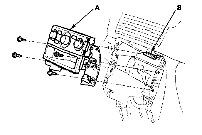 2. Remove the screws, and remove the heater control panel (A) with the brackets from the dashboard, then disconnect the connector (B).