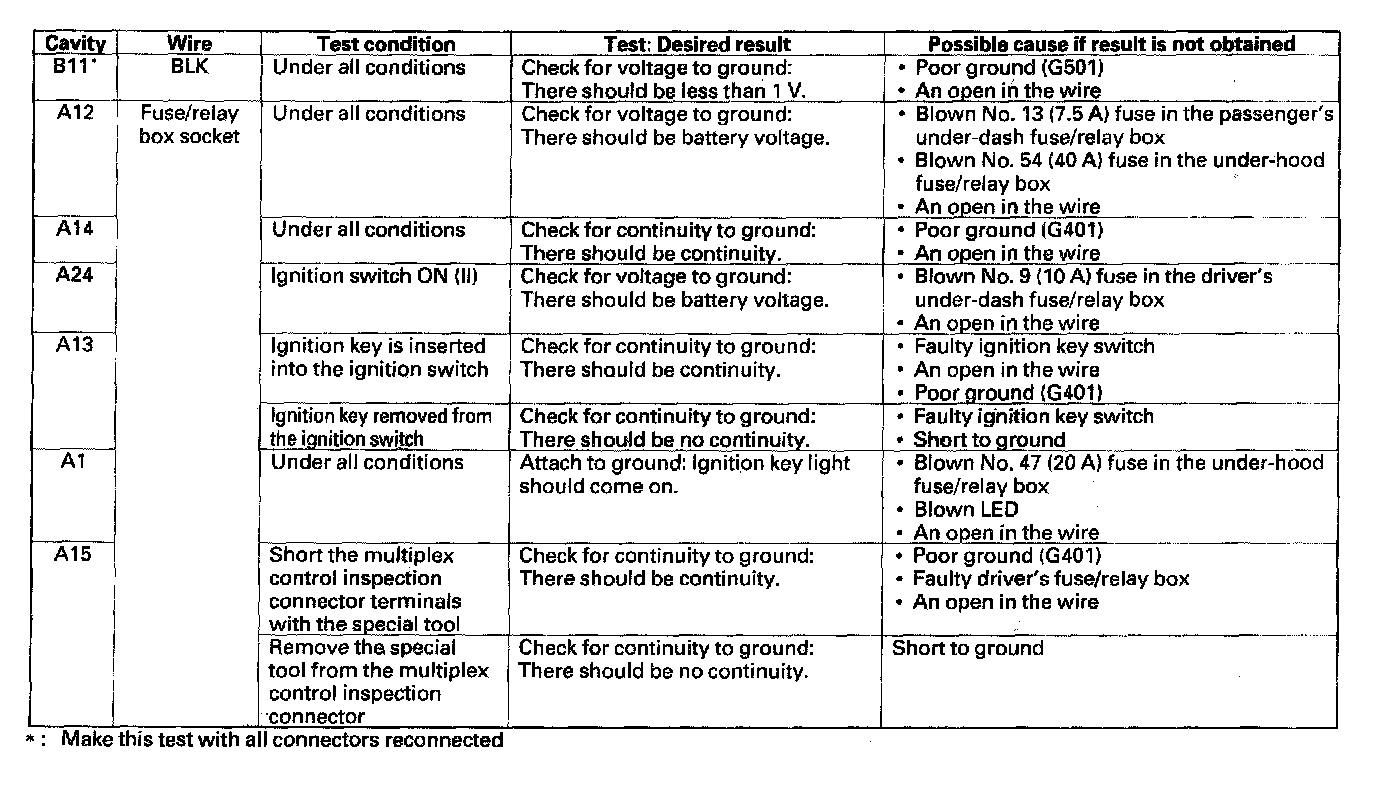Multiplex Control Unit Input TestBefore performing the multiplex control unit input test, do the multiplex troubleshooting (Mode 1 and Mode 2).