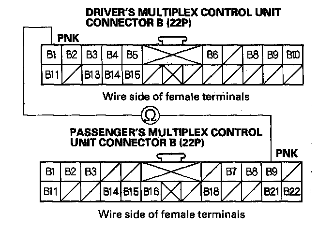 3. Check for continuity between B1 terminal of the driver's multiplex connector B (22P) and B9 terminal of the passenger's multiplex connector B (22P).