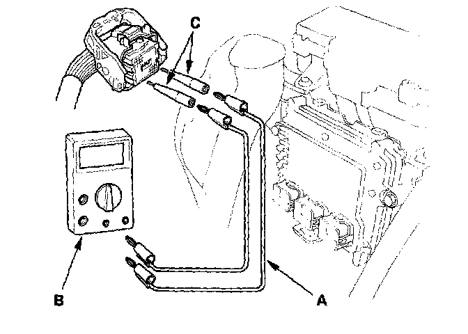 4. Connect one side of the patch cord (A) terminals to a commercially available digital multimeter (B), and connect the other side of the patch cord terminals to a commercially available banana jack (Pomona Electronics Tool No.3563 or equivalent) (C).