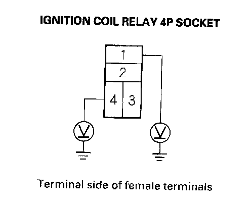 3. Measure the voltage between ignition coil relay 4P socket terminal No. 1 and body ground, then terminal No. 4 and body ground.