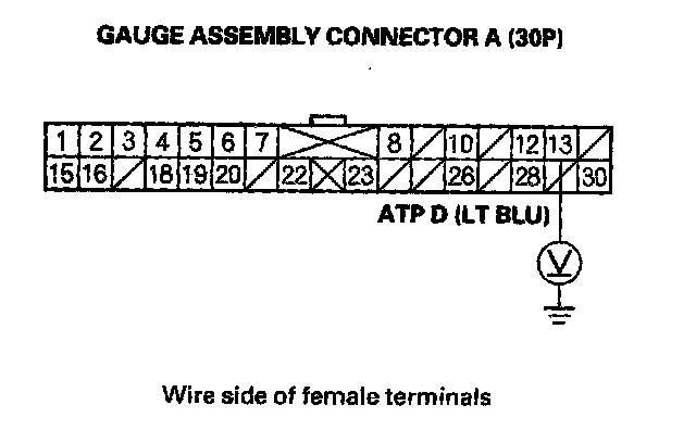 8. Shift to the D position, and check for voltage between terminal A13 (LT BLU) and body ground. There should be 0 V in the D position. There should be battery voltage in any other shift lever position.