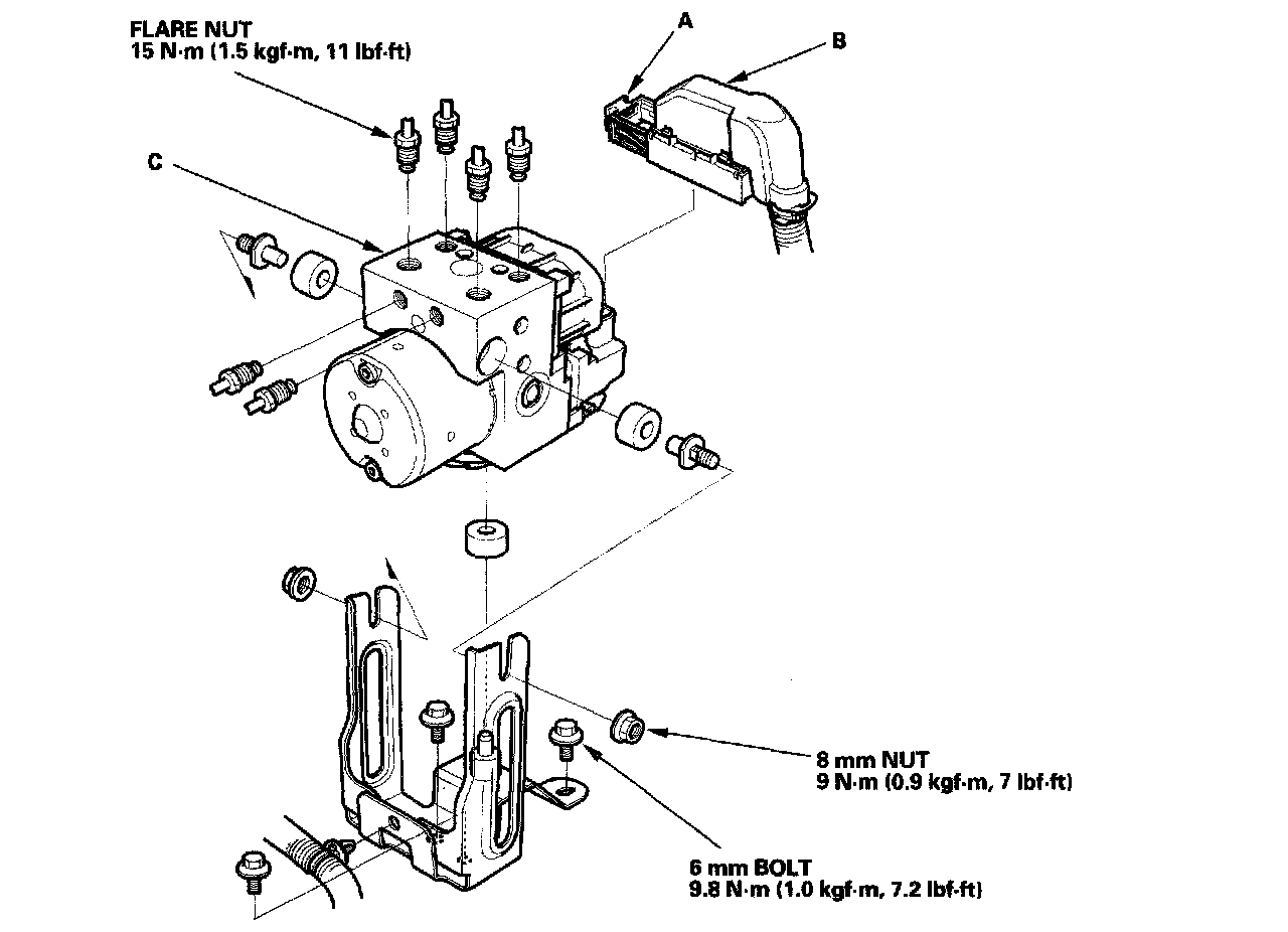 1. Install the ABS modulator-control unit, then tighten the two 8 mm nuts.
