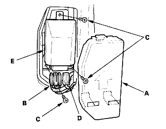 1. Place the new OPDS unit (A) on the seat-back frame. Tighten the three screws (B), and connect the OPDS harness 8P connector D and sensor connectors to the OPDS unit. Reinstall the cover (C).