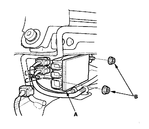 5. Disconnect the connectors from the front passenger's weight sensor unit (A). Remove the mounting nuts (B) and the front passenger's weight sensor unit from the seat riser.