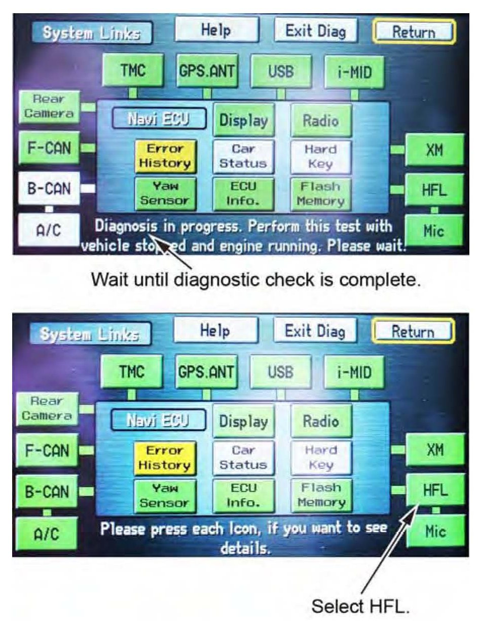 5. The System Link screen appears and does an automatic diagnostic check. Wait a few moments while the process completes. Once completed, select HFL.