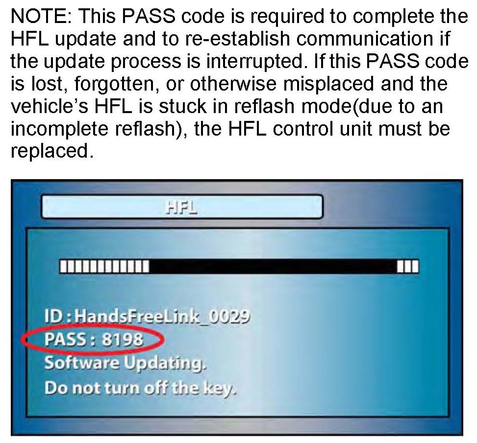 8. The HFT software update screen displays a 4-digit PASS code. Write it down on a piece of paper or on the RO and leave it in the vehicle.