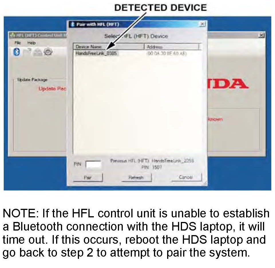 25. In the HFL update tool, the "Pair with HFL" window pops up. Wait a moment while Bluetooth devices are detected. If no devices are found after 30 seconds or so, click Refresh.