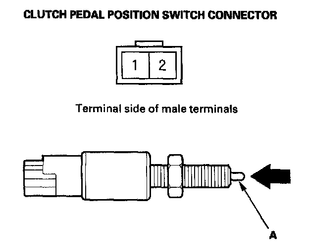 2. Check for continuity between the clutch pedal position switch connector terminals. There should be no continuity between the terminals with the button (A) released, and there should be continuity with the button pressed.