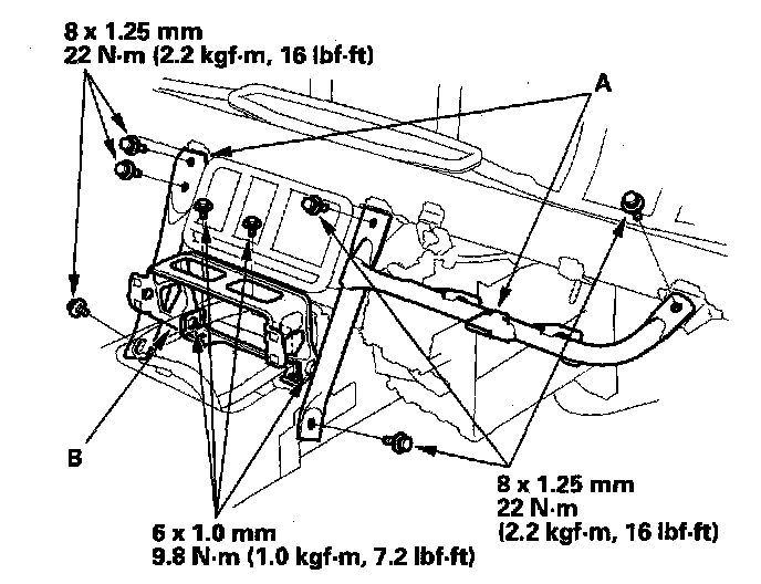 10. Remove the mounting bolts, the center brackets (A), and the audio brackets (B).