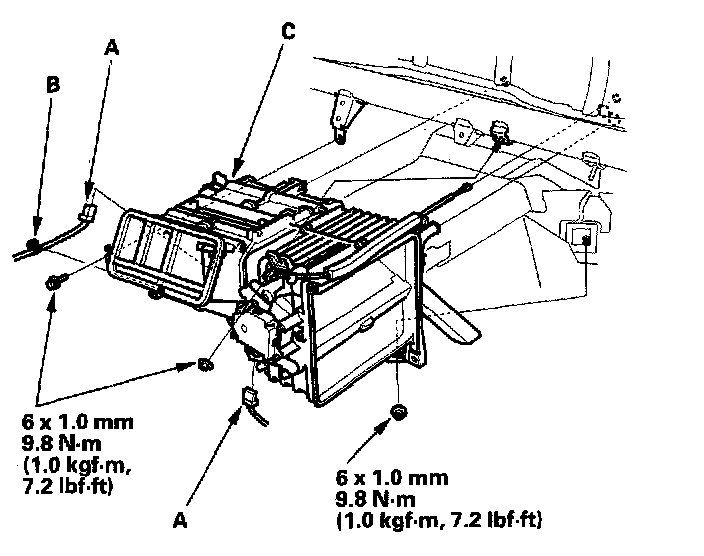 13. Disconnect the connectors (A) from the mode control motor and the air mix control motor, then remove the wire harness clip (B). Remove the mounting nuts, the mounting bolt, and the heater unit (C).