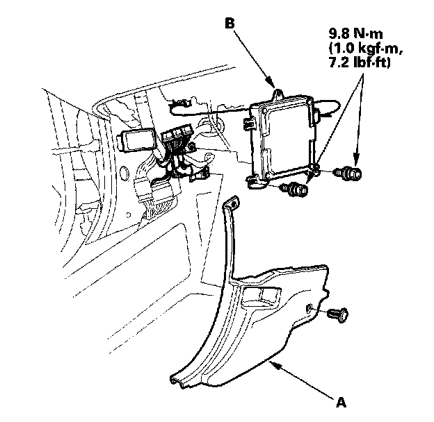 3. Remove the left side kick panel (A) to expose the ECM(B).