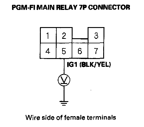 5. Turn the ignition switch ON (II), and measure voltage between body ground and PGM-FI main relay 7P connector terminal No. 5.
