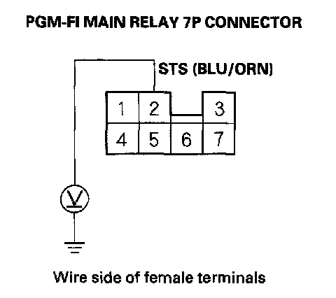 7. Push the clutch pedal in, then turn the ignition switch ON (II), and press the engine start button. Measure voltage between body ground and PGM-FI main relay 7P connector terminal No. 2.