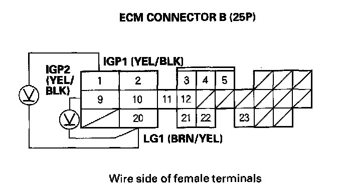 12. Turn the ignition switch ON (II), and measure voltage between ECM connector terminals B1 and B20, and between B9 and B20 individually.