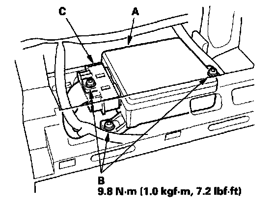 1. Install the new SRS unit (A) with Torx bolts (B), then connect the SRS unit 18P connector (C) to the SRS unit; push it into position until it clicks.