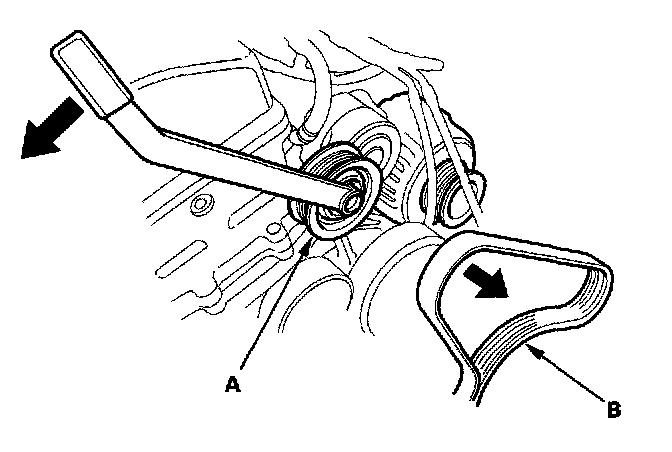 3. Move the auto-tensioner (A) to relieve tension from the drive belt, and remove the belt (B).