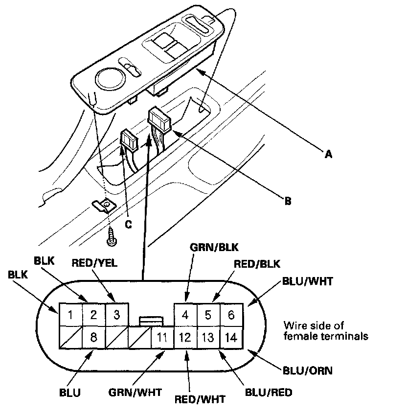 3. Disconnect the 14P connector (B) and the 10P connector (C) from the power window master switch.