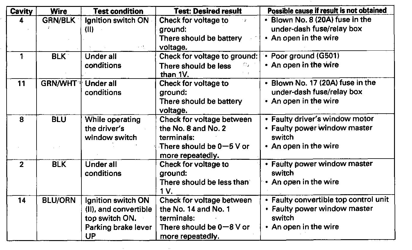 5. Reconnect the power window master switch, and perform the following input tests at the 14P connector.