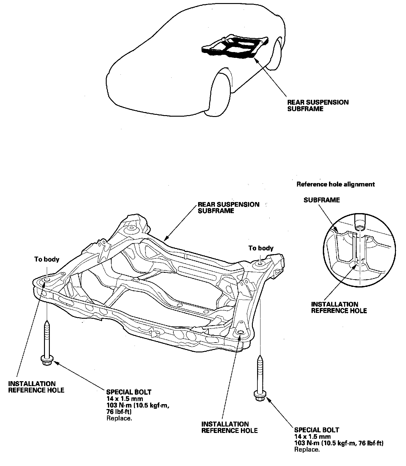 After removing the subframe mounting bolts, be sure to replace them with new ones.
