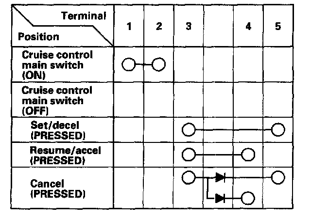 - If there is continuity, and it matches the table, but switch failure occurred on the cruise control unit input test, check and repair the wire harness on the switch circuit.