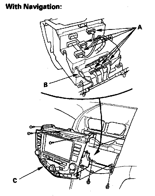 4. Remove the screws and bolts, disconnect the audio-HVAC display module connectors (A) and the antenna lead (B), then remove the audio-HVAC display module (C).