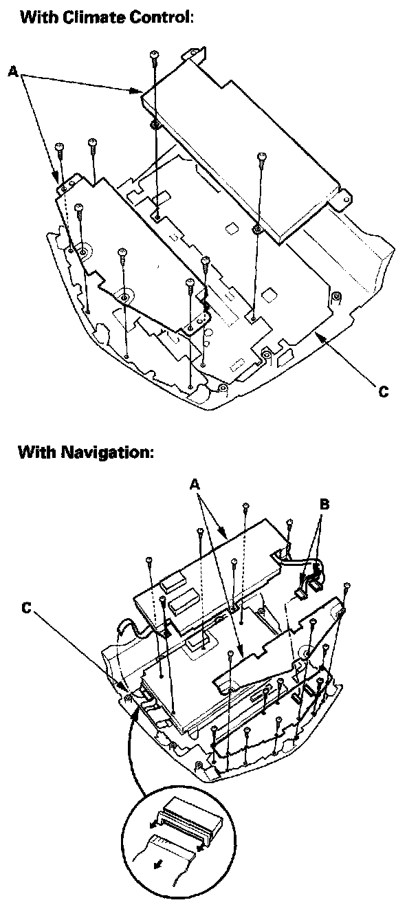 2. Remove the mounting screws and the covers (A), then disconnect the connectors (B) (Navigation system) from the printed circuit board (C).