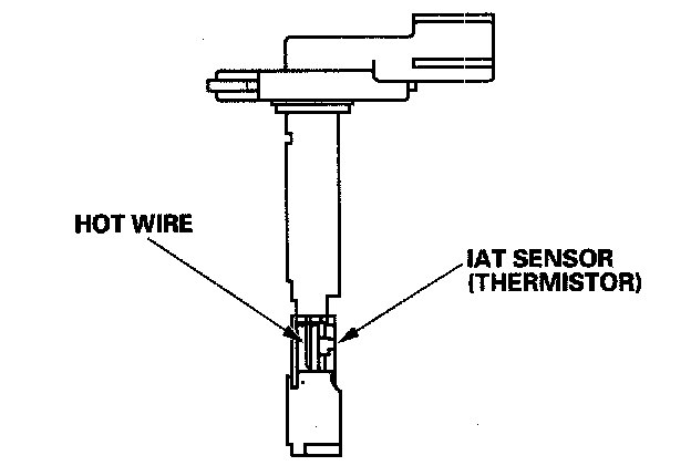 The mass airflow/intake air temperature (MAF/IAT) sensor contains a hot wire and a thermistor. It is located in the intake air passage. The resistance of the hot wire and thermistor change due to intake air temperature and airflow. The control circuit in the MAF sensor controls the current to keep the hot wire at a set temperature. The current is converted to voltage in the control circuit, then output to the ECM/PCM.