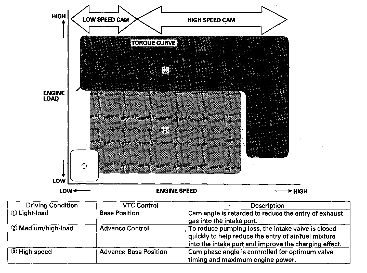 - The VTC system makes continuous intake valve timing changes based on operating conditions.