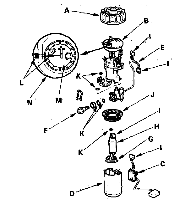 11. Install the parts in the reverse order of removal with a new base gasket (J), new locknut, and new O-rings (K). When installing the fuel tank unit, align the marks (L) on the unit (M) and the fuel tank (N).