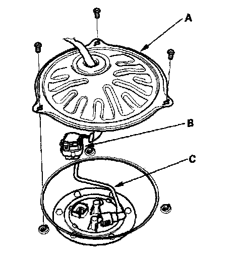 8. Remove the strainer case (A), the fuel gauge sending unit (B), and the wire harness (C).