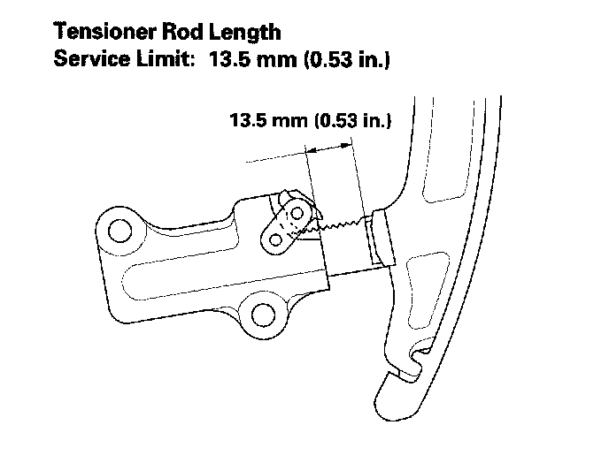 Measure the tensioner rod length between the tensioner body and bottom of the flat surface section on the tensioner rod. If the length is over the tolerance, replace the cam chain and oil pump chain.