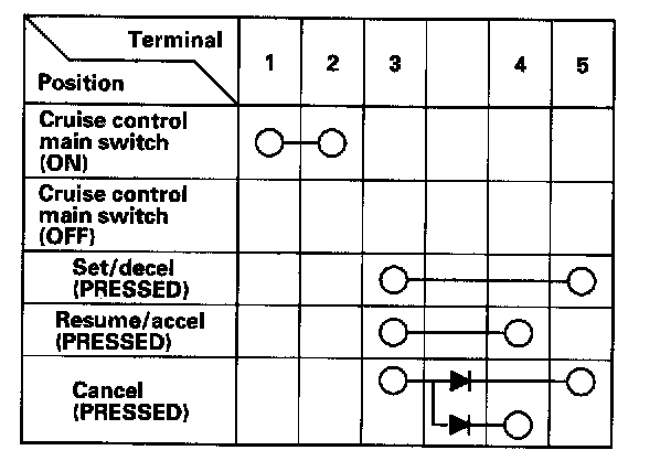 - If there is continuity, and it matches the table, but switch failure occurred on the cruise control unit input test, check and repair the wire harness on the switch circuit.