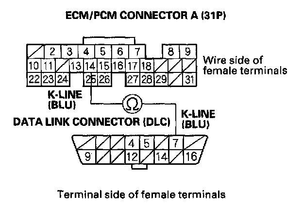 NO - Repair open in the wire between DLC terminal No. 7 and the ECM/PCM (A14). After repairing the wire, check for Temporary DTCs or DTCs with the HDS and go to the indicated DTC's troubleshooting.