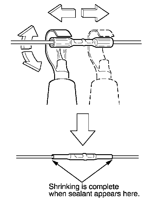 13. Plug in the heat gun, and turn it on. Start at the middle of the splice connector, and move the gun toward the ends as the tube shrinks. Apply heat evenly by rotating the curved heat spreader around the splice connector. Shrinking is complete when a small amount of sealant appears at each end of the tube.