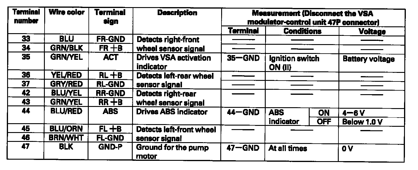VSA Modulator-Control Unit Inputs and Outputs for 47P Connector: