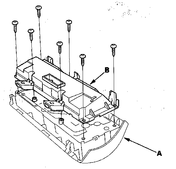 2. Remove the self-tapping screws, then carefully separate the heater control panel display (A) from the control panel (B). Do not kink or pull on the wires between the display and the control panel. Do not touch the electronic components on the printed circuit board in the control panel.