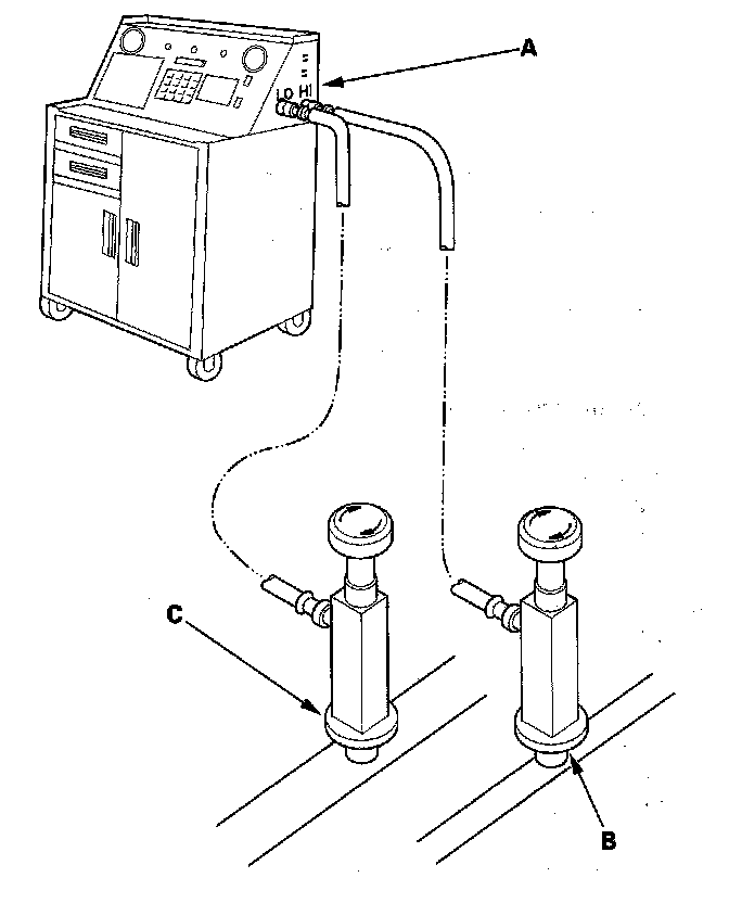 1. Connect an R-134a refrigerant recovery/recycling/charging station (A) to the high-pressure service port (B) and the low-pressure service port (C), as shown, following the equipment manufacturer's instructions.