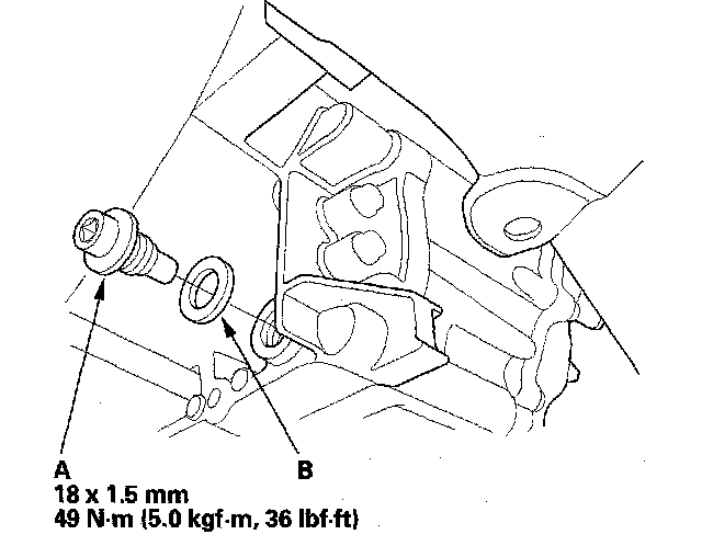 3. Remove the drain plug (A), and drain the automatic transmission fluid (ATF). Then reinstall the drain plug with a new sealing washer (B).