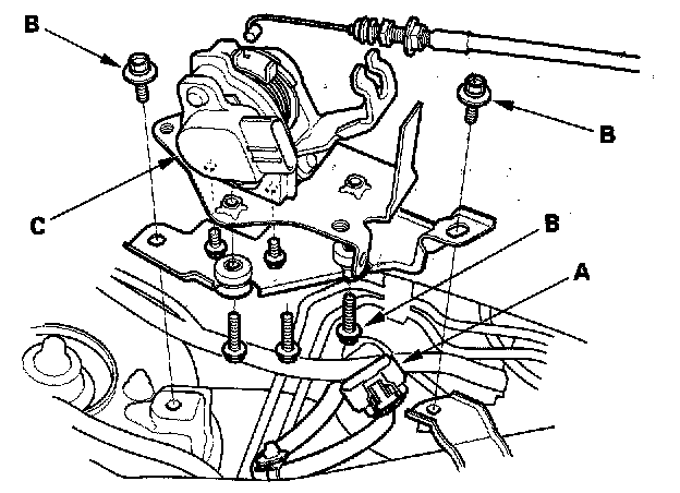 3. Remove the bolts (B), and the APP sensor (C).