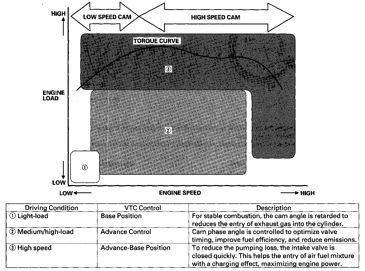 - The VTC system makes continuous intake valve timing changes based on operating conditions.