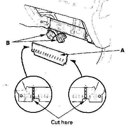 9. Cut the plastic cross brace in the glove box opening with diagonal cutters in the area shown. Remove and discard the plastic cross brace (A).